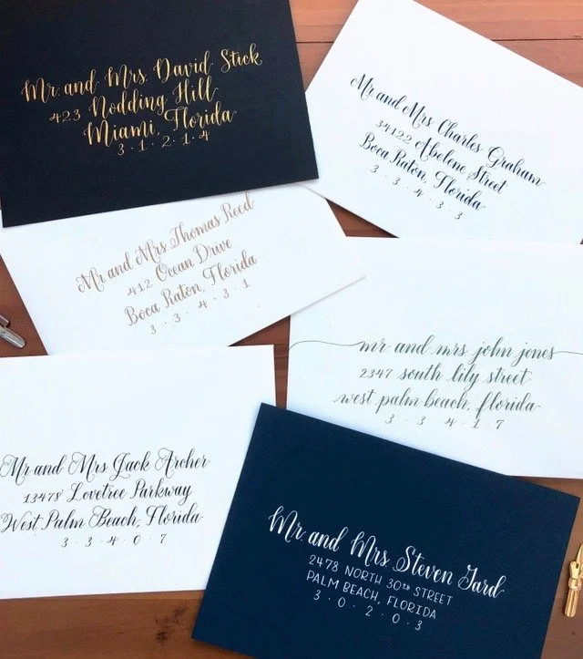 We offer On Site calligraphy from Orlando to Miami, envelope and place card calligraphy and custom orders. Contact us for pricing and availability.